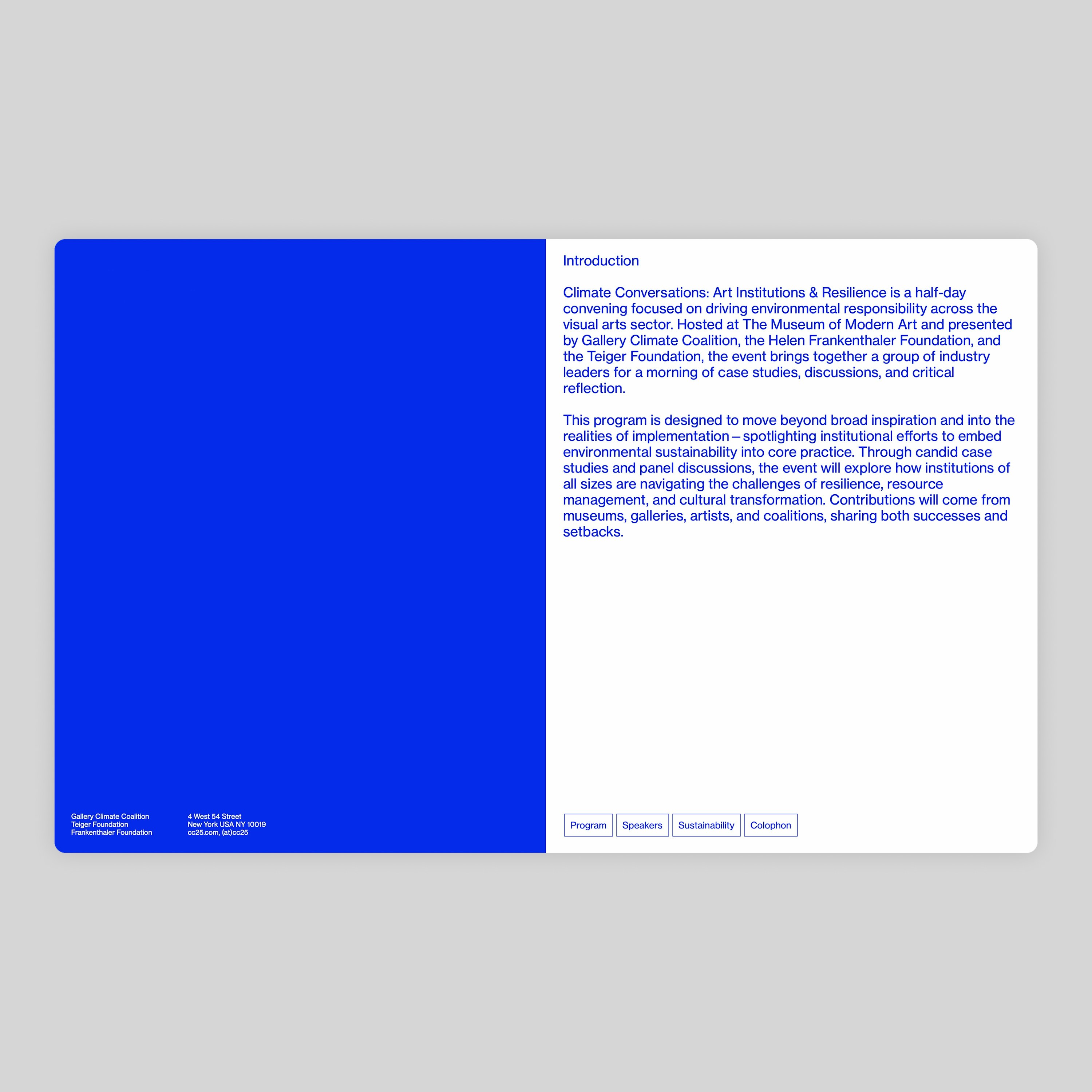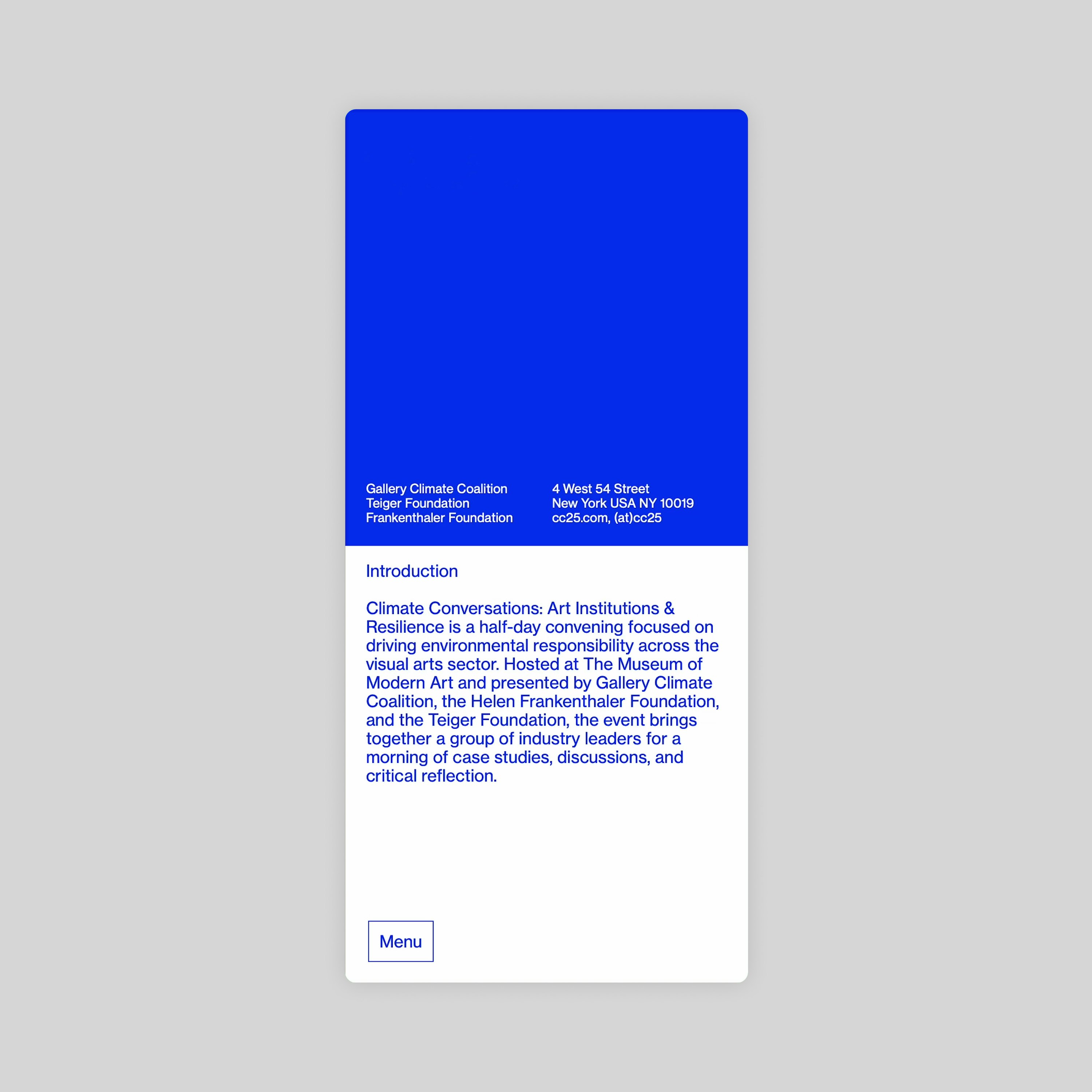 Given that the event focused on sustainability we tried to keep printing to a minimum, and leverage existing components that MoMA had. This lead to us focus on a digital first solution using animation and vibrant blue that worked well on screen.