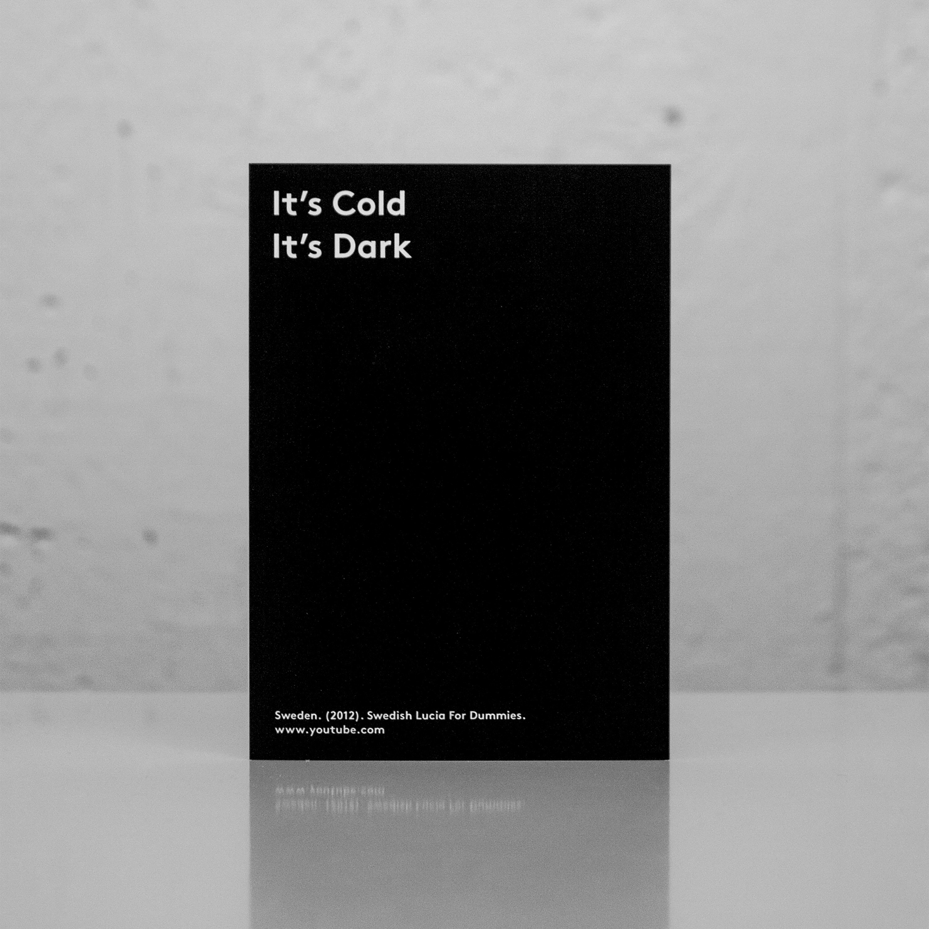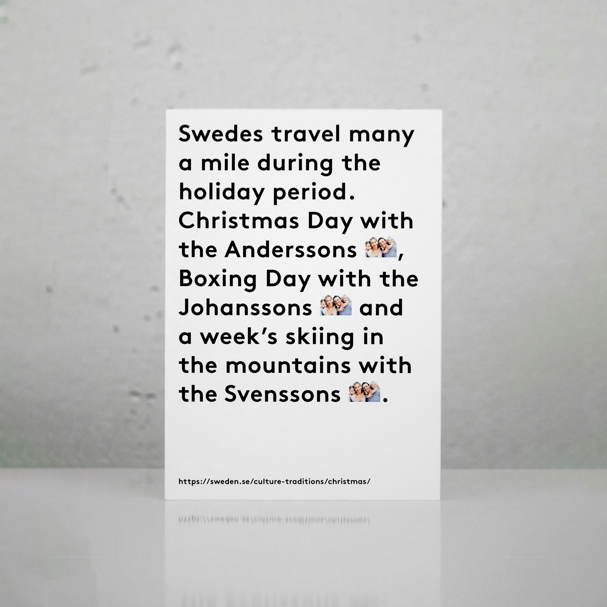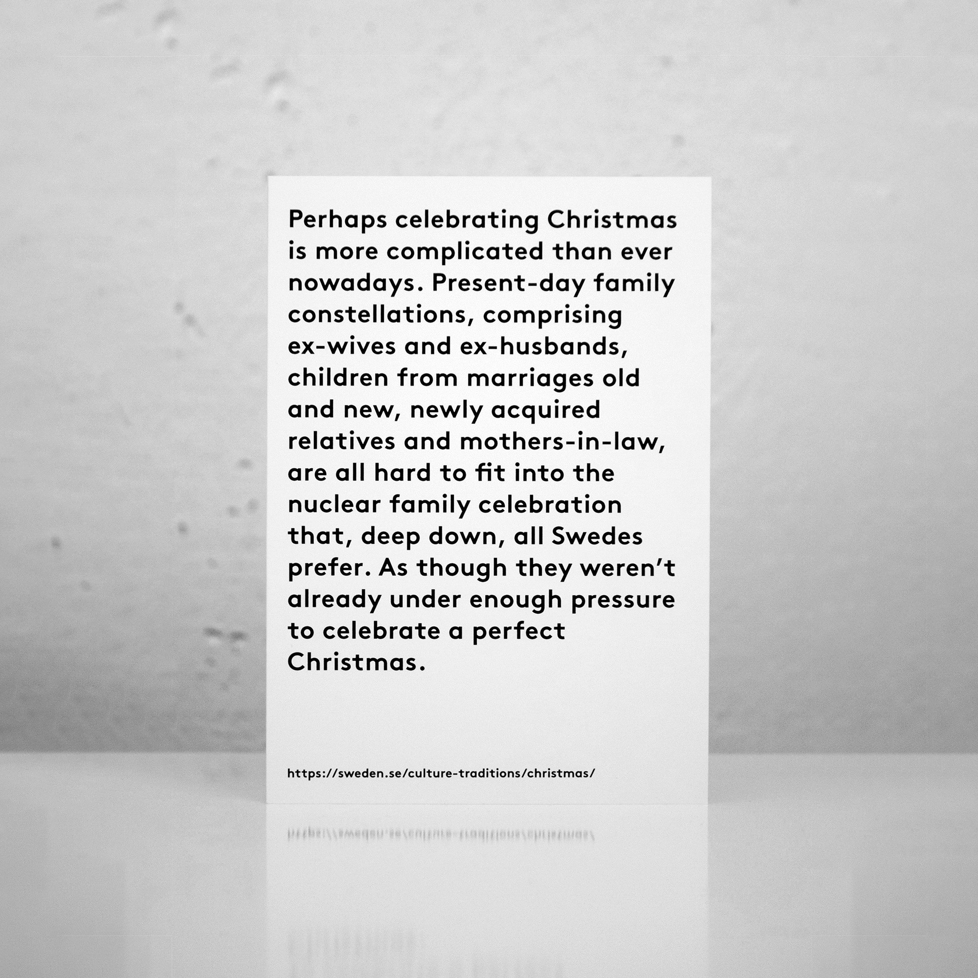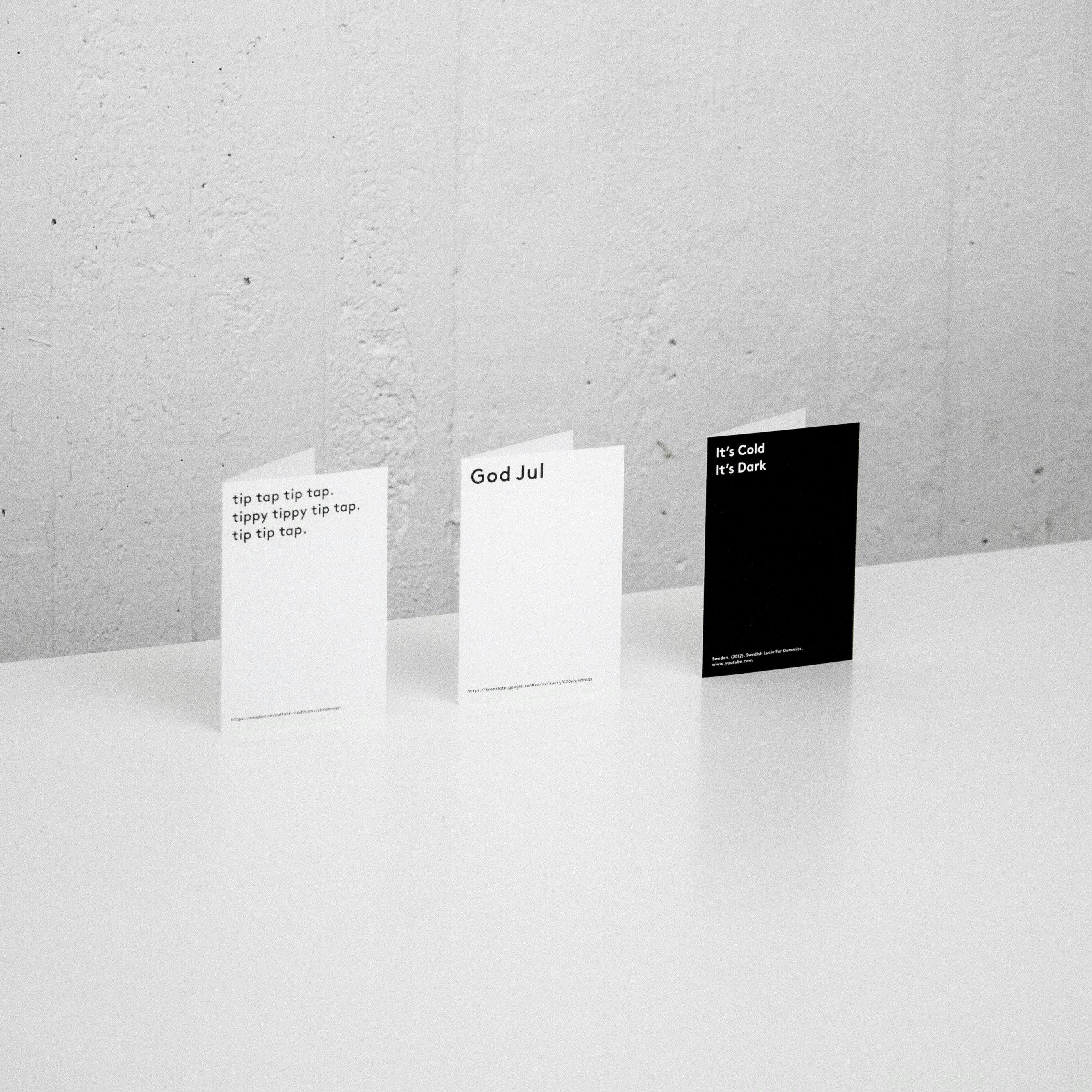 The series of cards and posters conveys our British perception of a Swedish Christmas experience, in relation to our own deeply entrenched, and often nonsensical expectations and rituals surrounding Christmas. All content was sourced from Sweden's official youtube channel and sweden.se; a publicly funded website supported by the Swedish Institute and Swedish Government, that aims to promote interest and confidence in Sweden around the world.