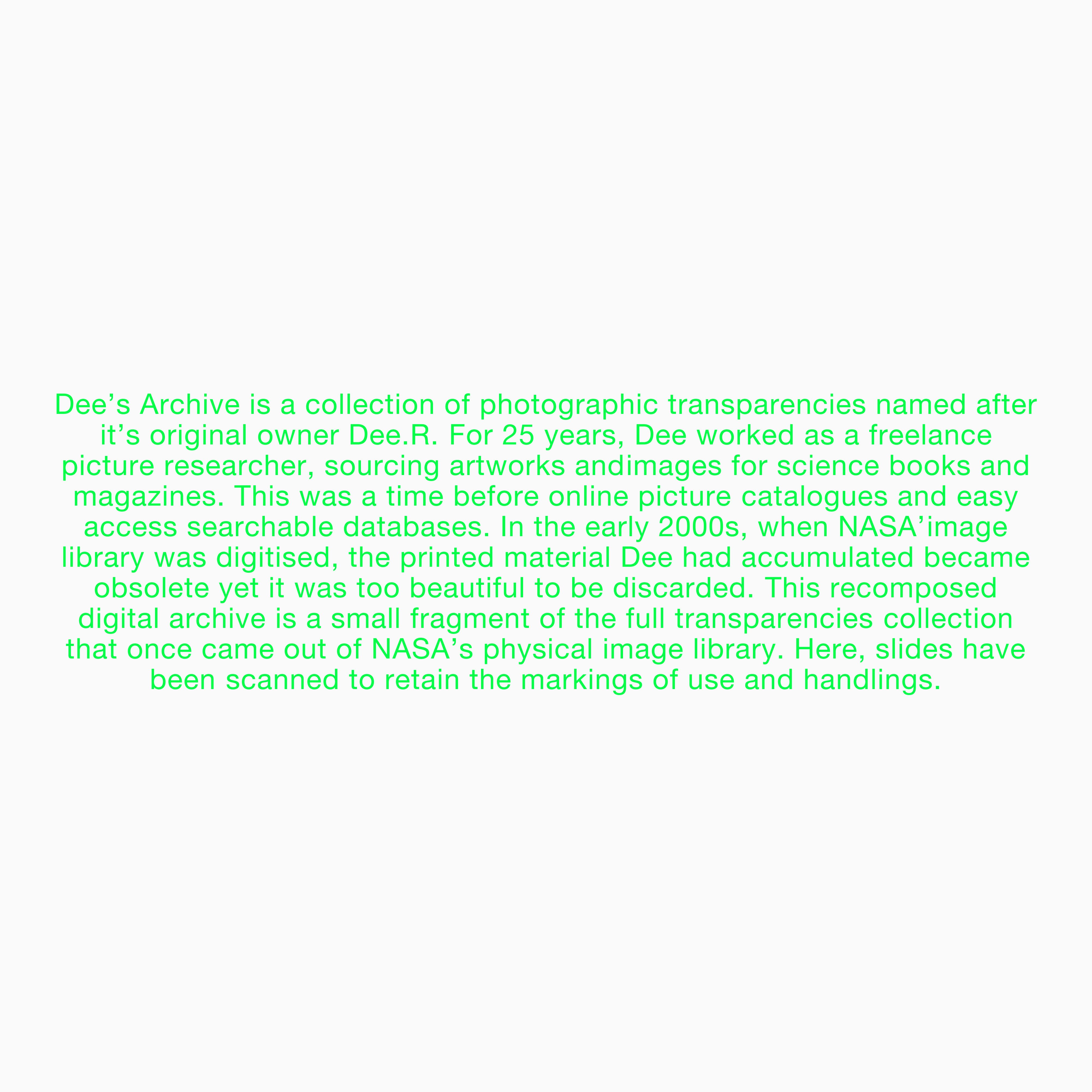 The archive was collected by Dee in the pre digital era and spans over 25 years, and was used by key scientific journals, books and magazines, charting some of the most historically significant moments in Nasa history. However, once Nasa digitised it’s archives in the early 2000’s much of this physical material became obsolete. Uma Termas felt as though this collection of material was too beautiful and historically significant to be discarded, and went about digitising the original transparencies.