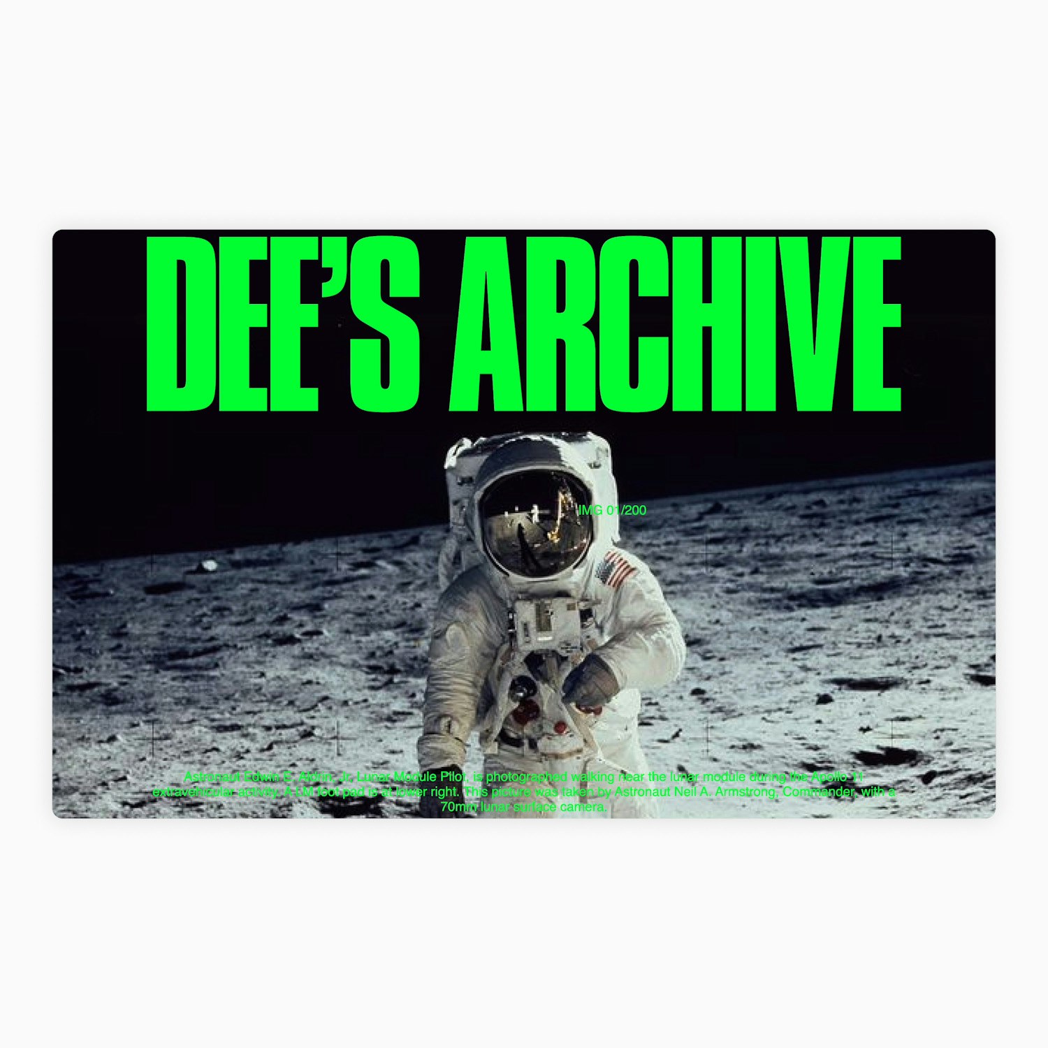 The logotype is the free typeface Compacta, which has serious weight and can hold its own when overlaid over a varied body of images, and the supporting text is Helvetica Neue. The type and logo is treated in RGB green to contrast heavily when overlaid on top of images. The site is one long carousel of 200 images sequenced in a unique random order every time a user arrives on the site, with a counter on the cursor to indicate your progress. Each image is supported by a caption sourced from Dee R’s original archive detailing the subject of each image.