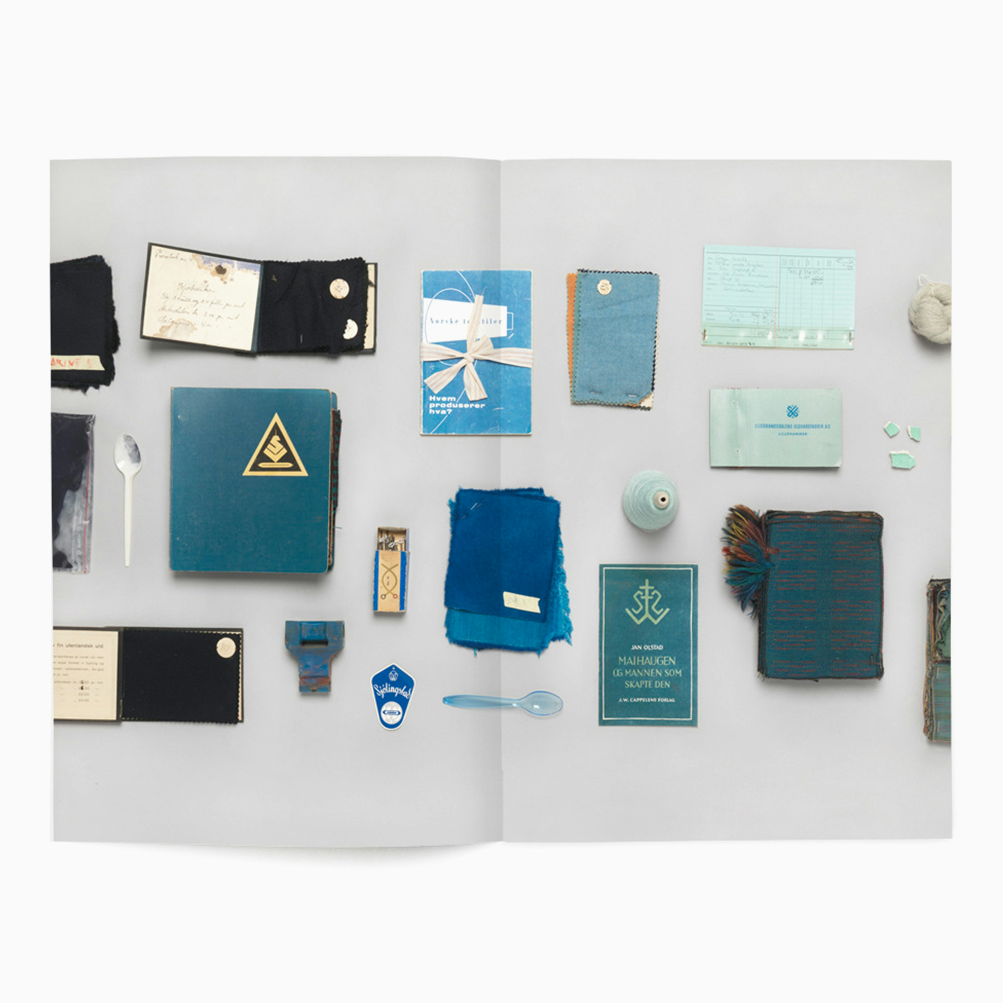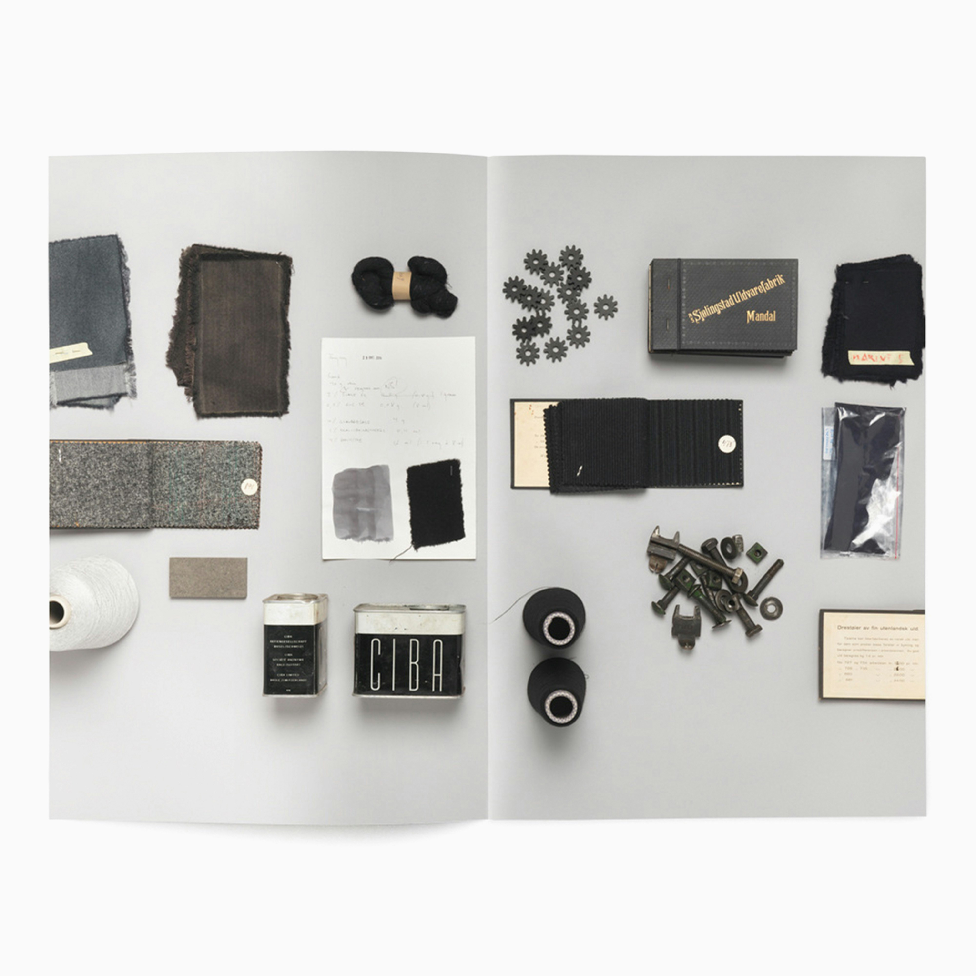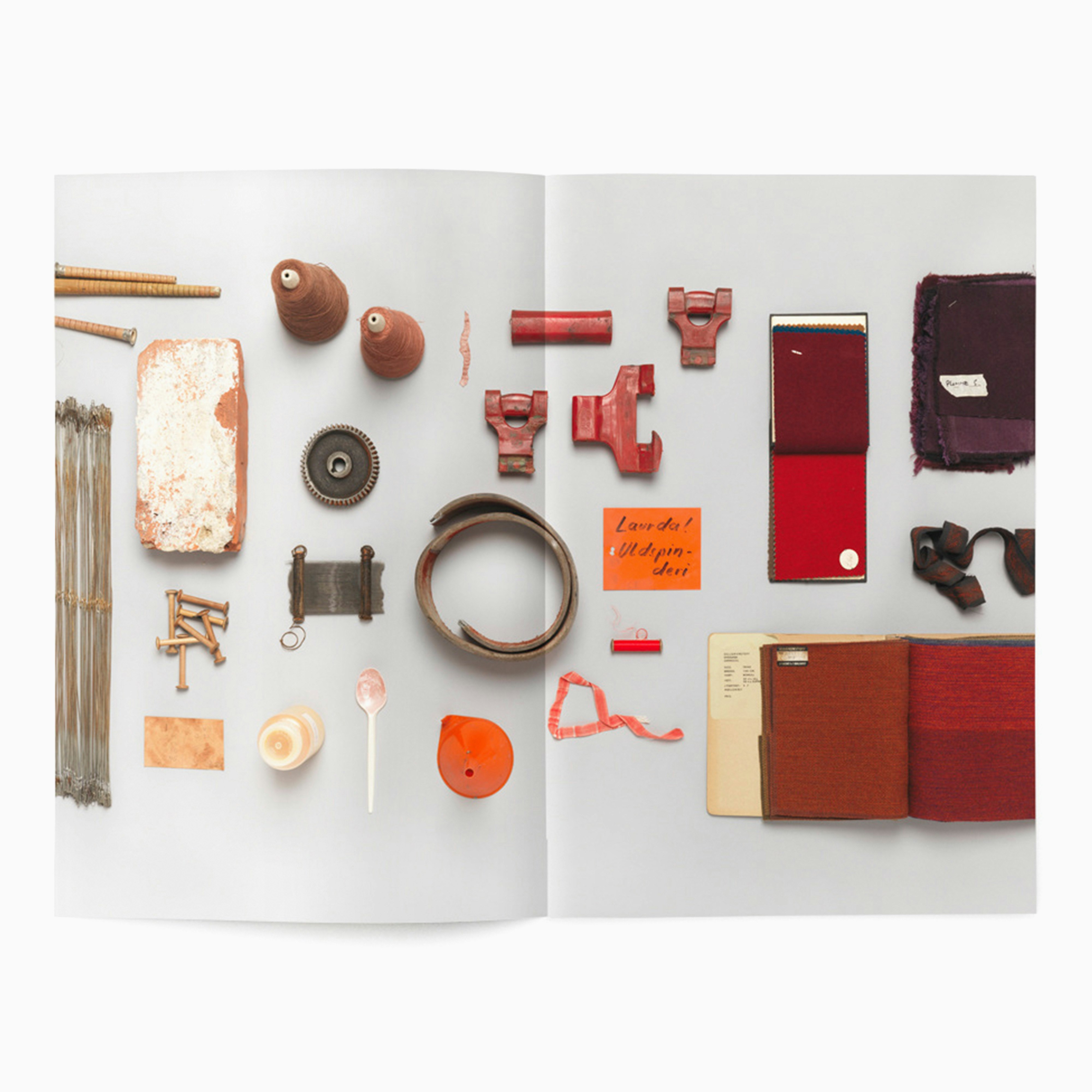 Franz Schmidt's research focus was reviving and re-purposing forgotten weaving techniques from Norwegian fabric manufacturing. This resulted in many field trips visiting abandoned factories, and collecting an archive of objects and process journals with which to inspire his own designs. We decided to organise this information visually, via arranging the objects by colour in one long line, and photographed them from above in a continuous stream. After which they were laid out full-bleed across the pages of the book, interspersed with written reflections on the development of the project.