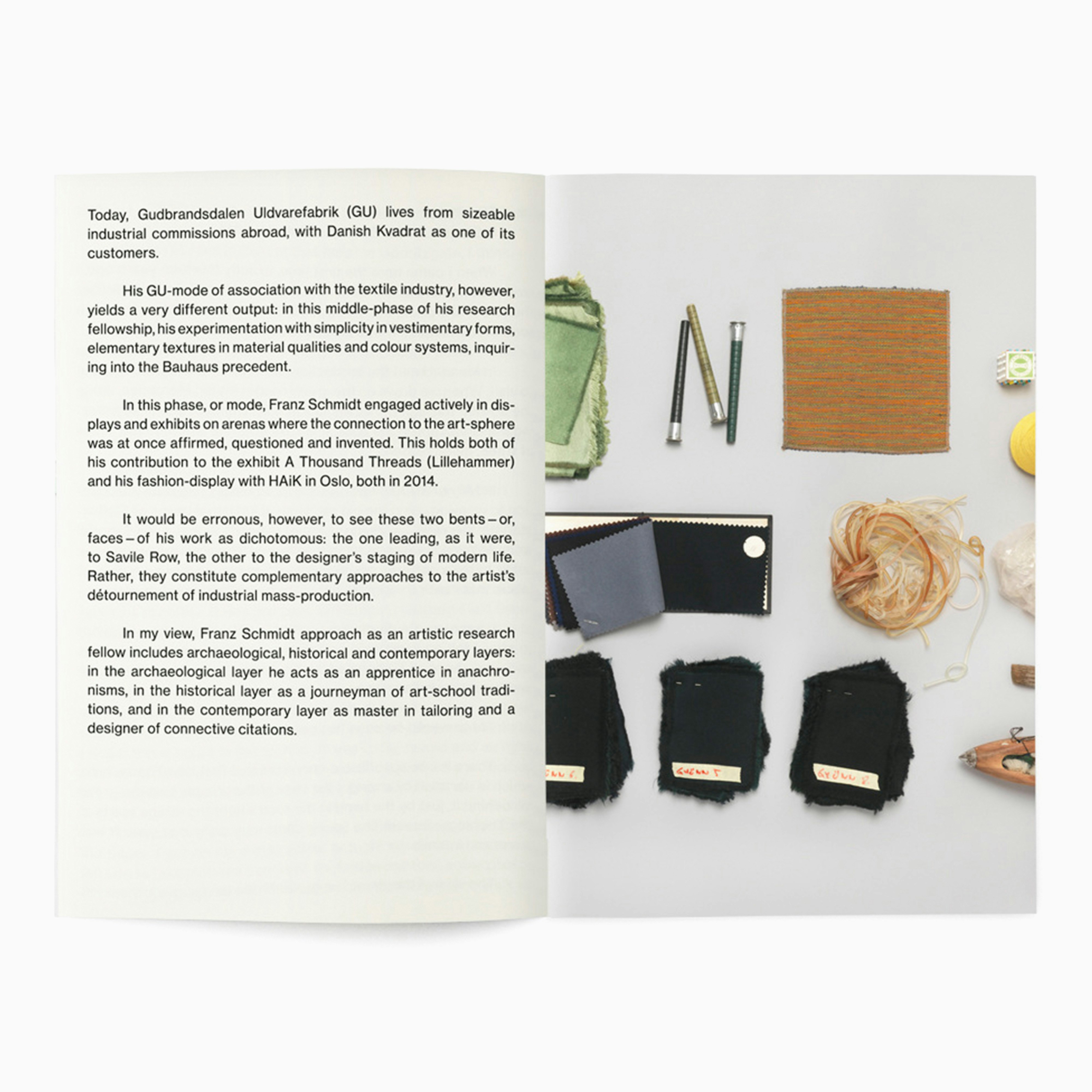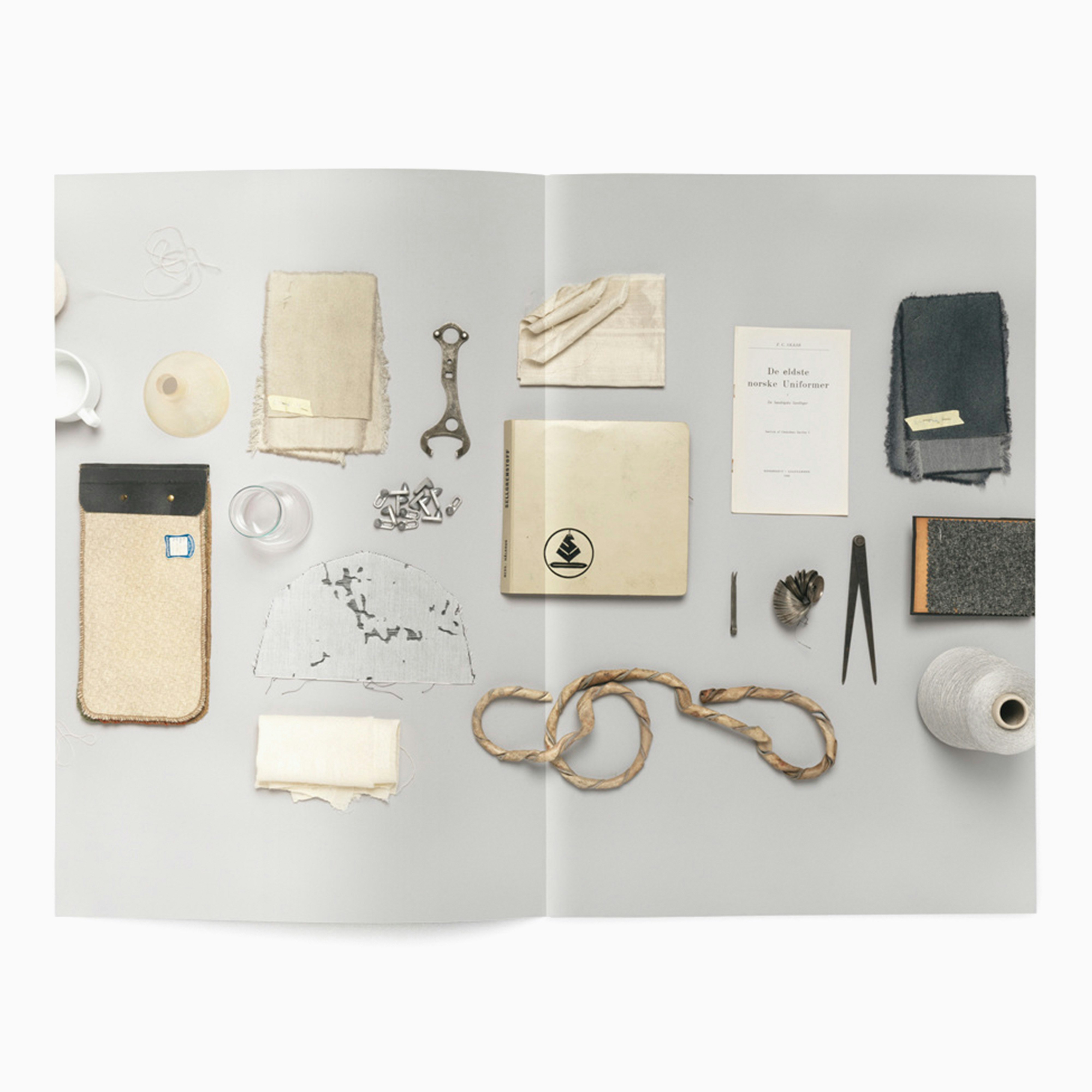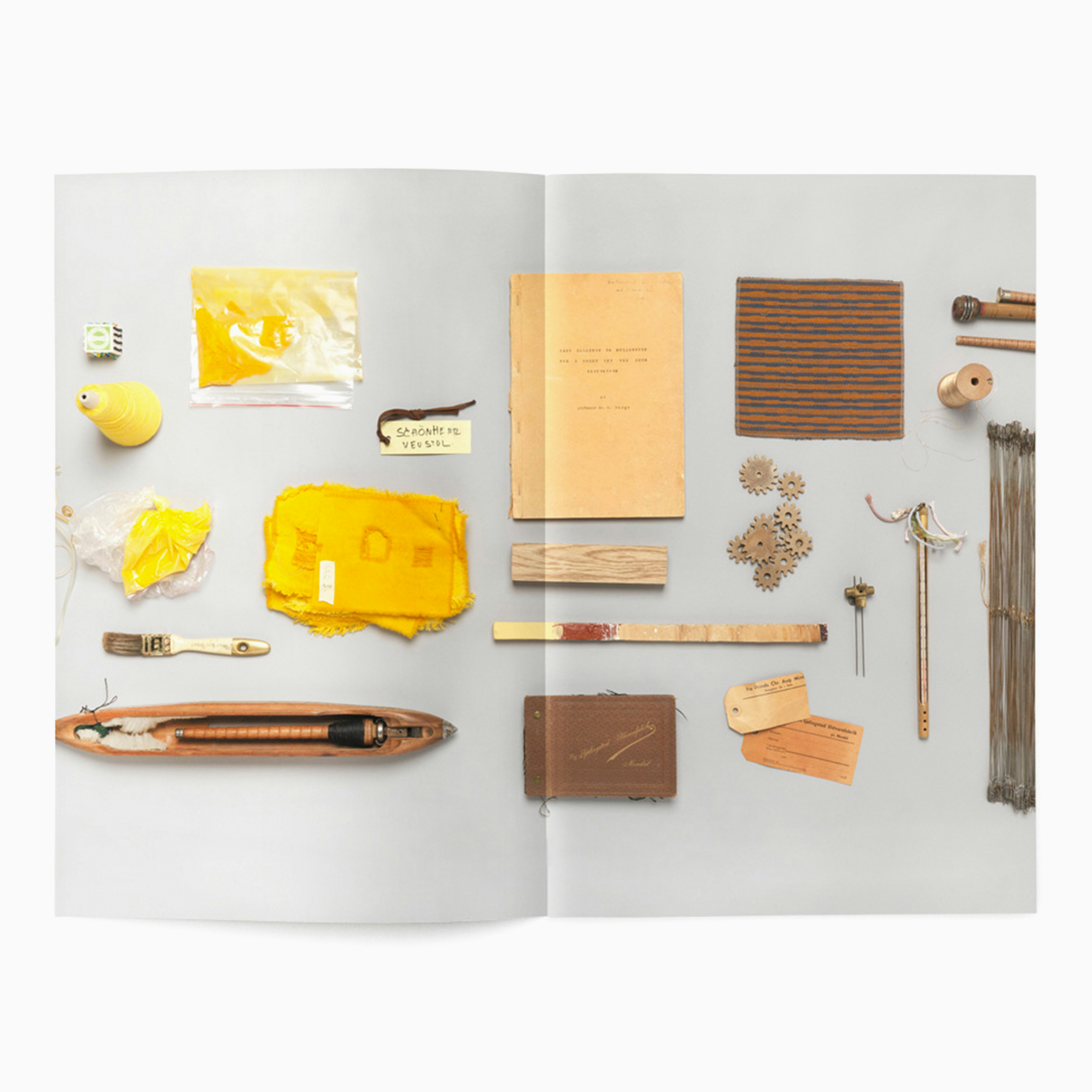 Franz Schmidt's research focus was reviving and re-purposing forgotten weaving techniques from Norwegian fabric manufacturing. This resulted in many field trips visiting abandoned factories, and collecting an archive of objects and process journals with which to inspire his own designs. We decided to organise this information visually, via arranging the objects by colour in one long line, and photographed them from above in a continuous stream. After which they were laid out full-bleed across the pages of the book, interspersed with written reflections on the development of the project.