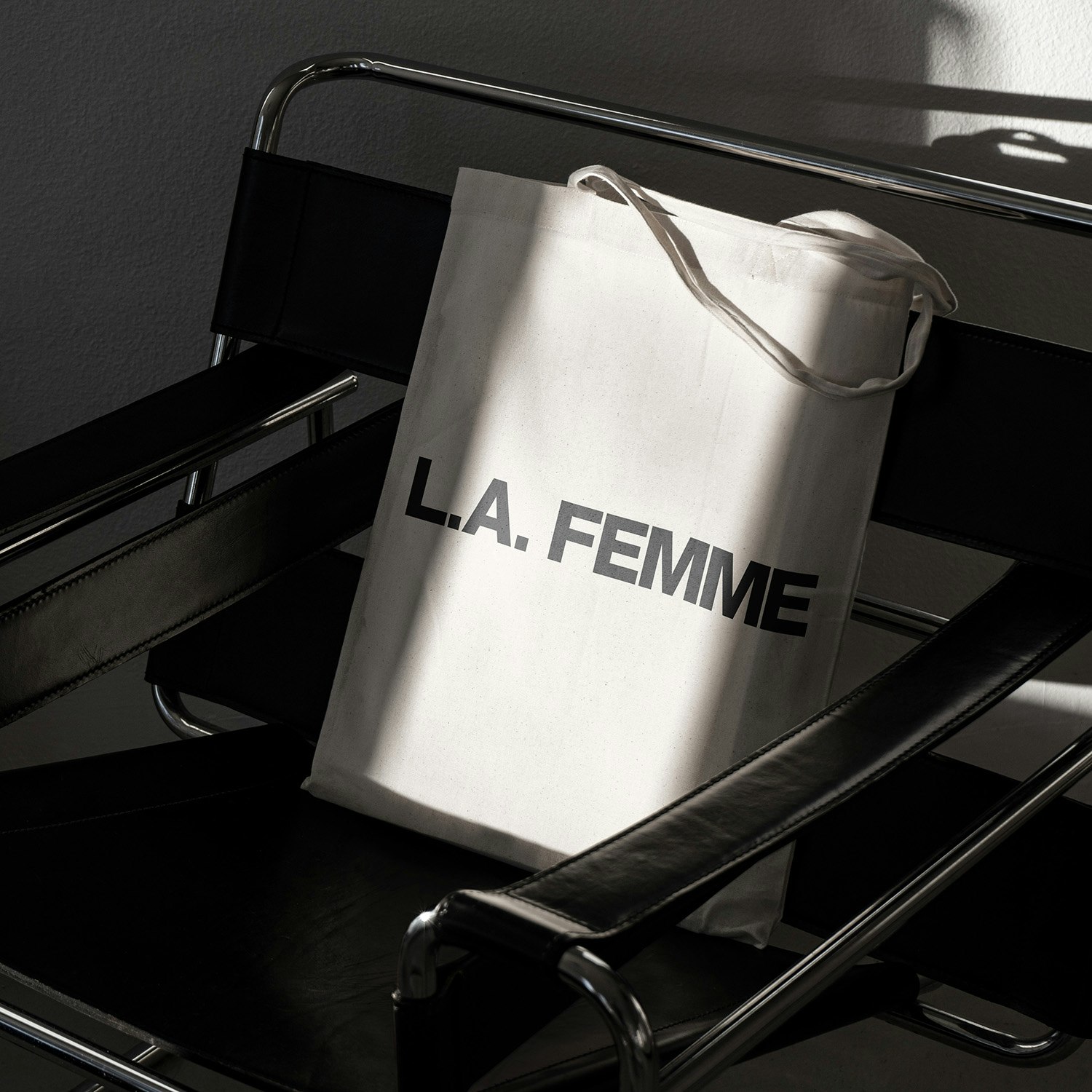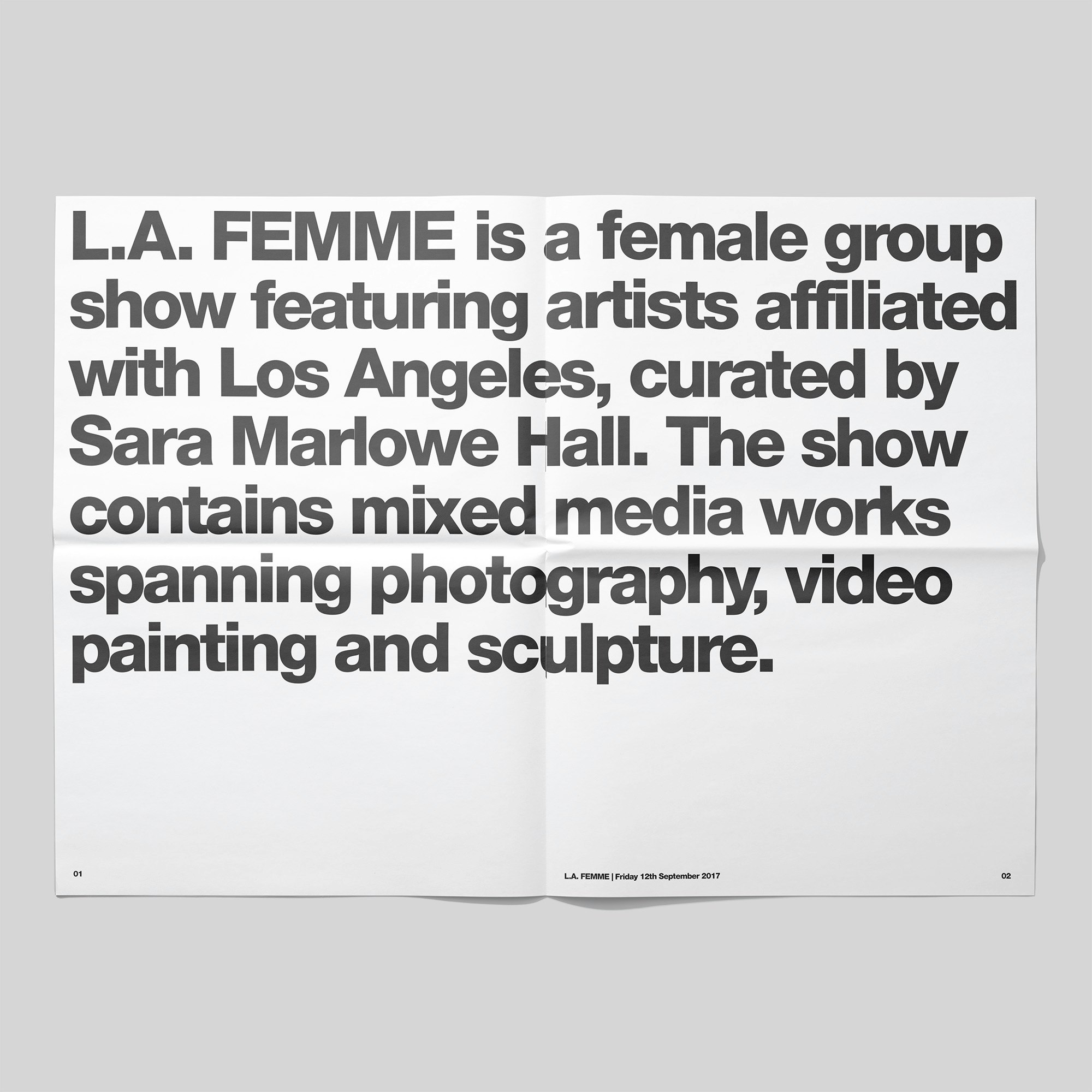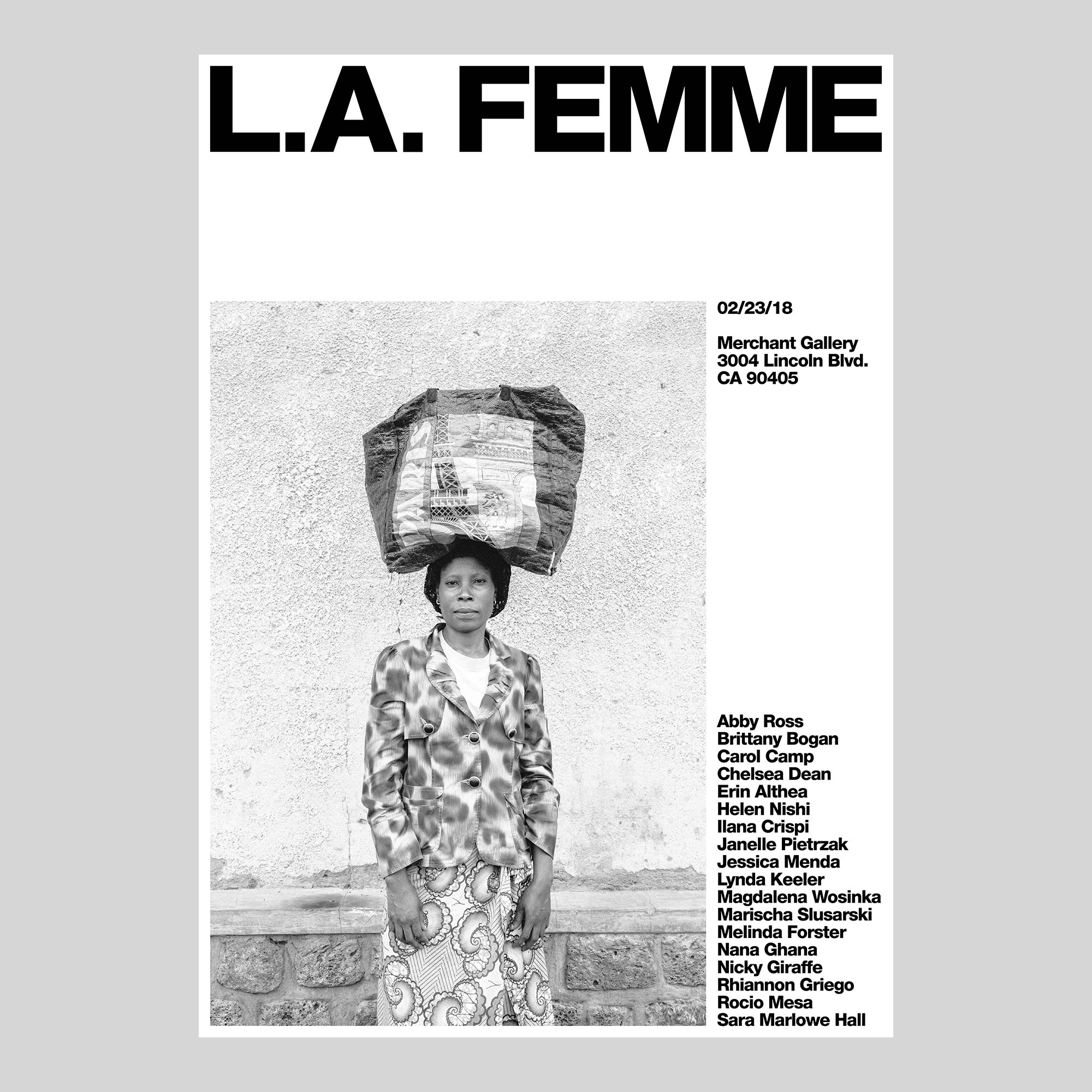 In 2018 I collaborated closely with gallery founder Sara Marlowe Hall to design the identity for "L.A. Femme," an all-female group show hosted at Merchant Gallery in Venice, CA. The primary goal was to challenge conventional associations with ‘feminine’ aesthetics. The visual identity adopted a black and white system, incorporating a logotype in capitalised Helvetica Neue Heavy Caps, and stencil case for titles, with Roman type for body text and captions. The project encompassed the creation of a logo, identity, publicity materials, website, and catalogue, ensuring a cohesive and compelling representation of "L.A. Femme" across various mediums.