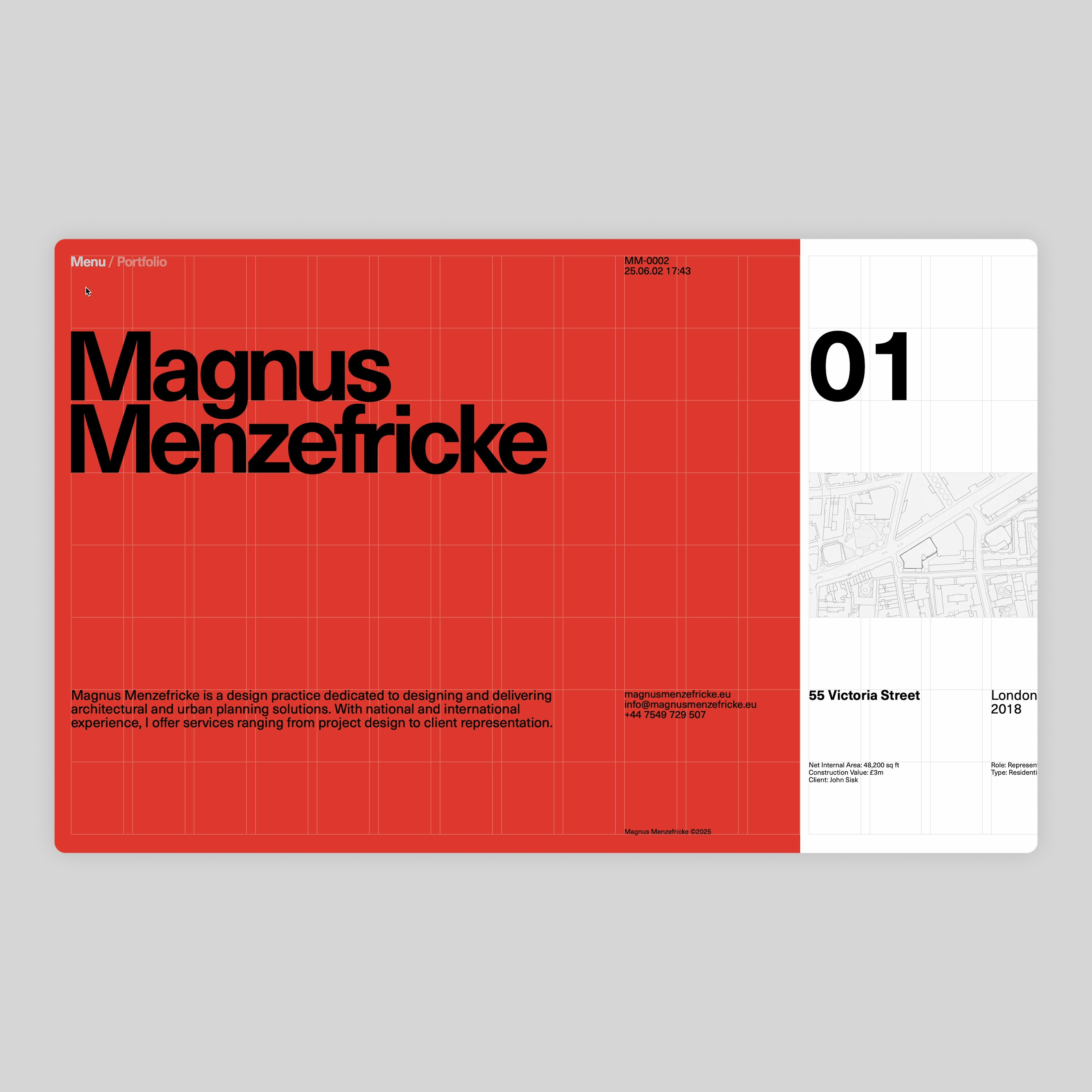 The project pages have a distinctly editorial feeling to them, the graphic language recedes into the background, enabling the user to focus on the imagery and allowing Magnus to tell stories about his design decisions. The proportions of the images however directly correlate to those placed within the underlying grid, to ensure a subconscious aesthetic through line between the different sections of the site.