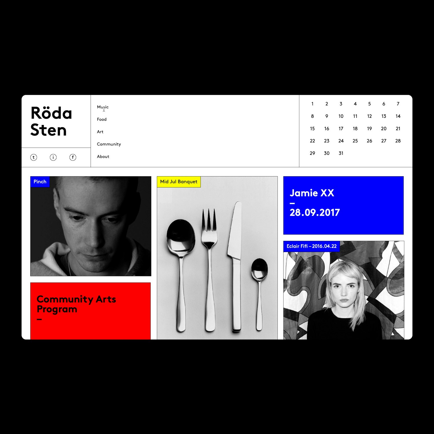 We focused on designing a smartphone oriented website that would allow users to see clearly what was happening at Roda Sten. Features included, breaking up its offering into a clear taxonomy using colour, interspersing cultural events, which served as the clients unique selling point, and including a 'now' button at the top of the menu, as many users wanted to know what was available in the present moment, when mobile. The visual identity was designed to convey the D.I.Y. approach of the institution, whilst achieving a visual consistency that could unify Roda Sten's diverse activities under one distinctive umbrella.