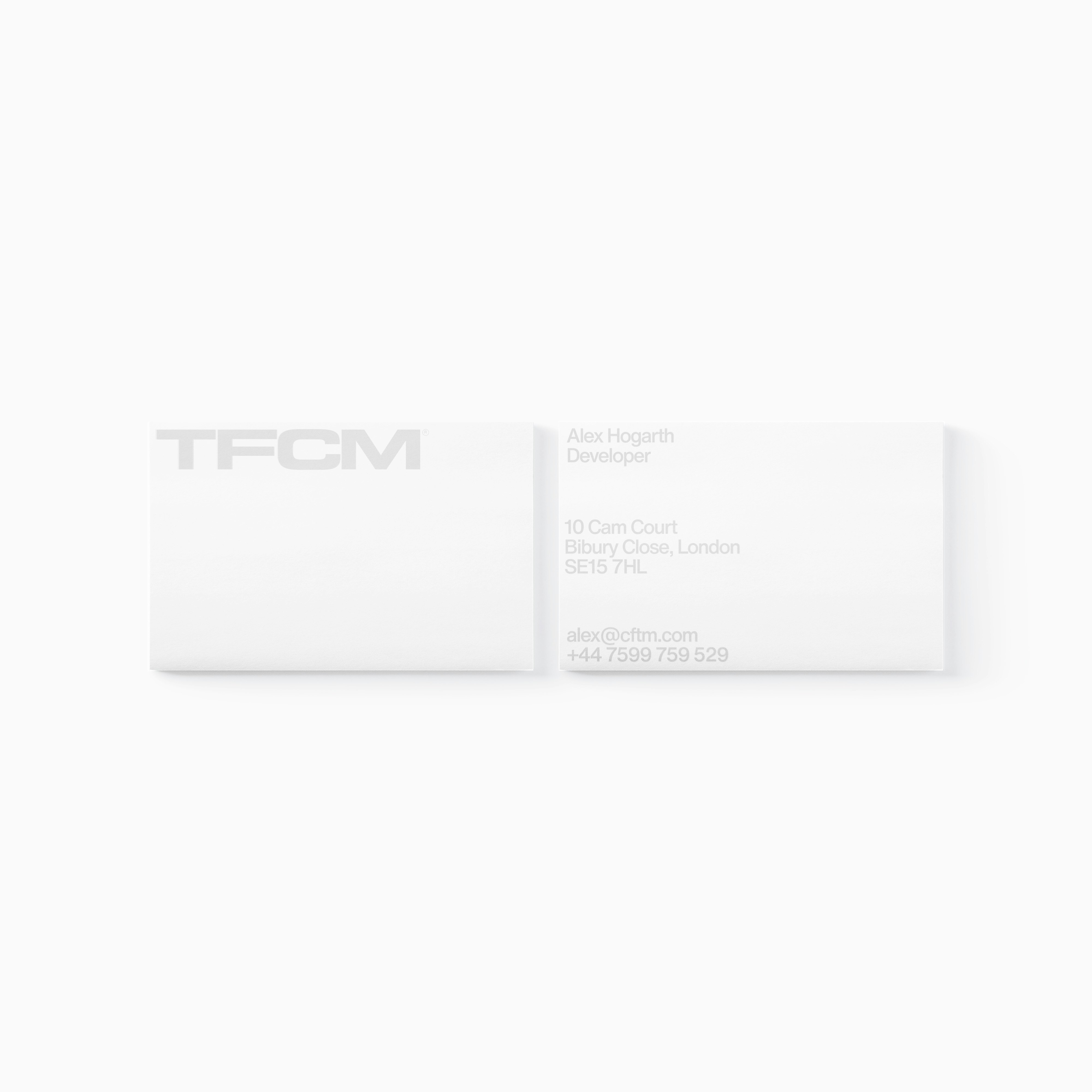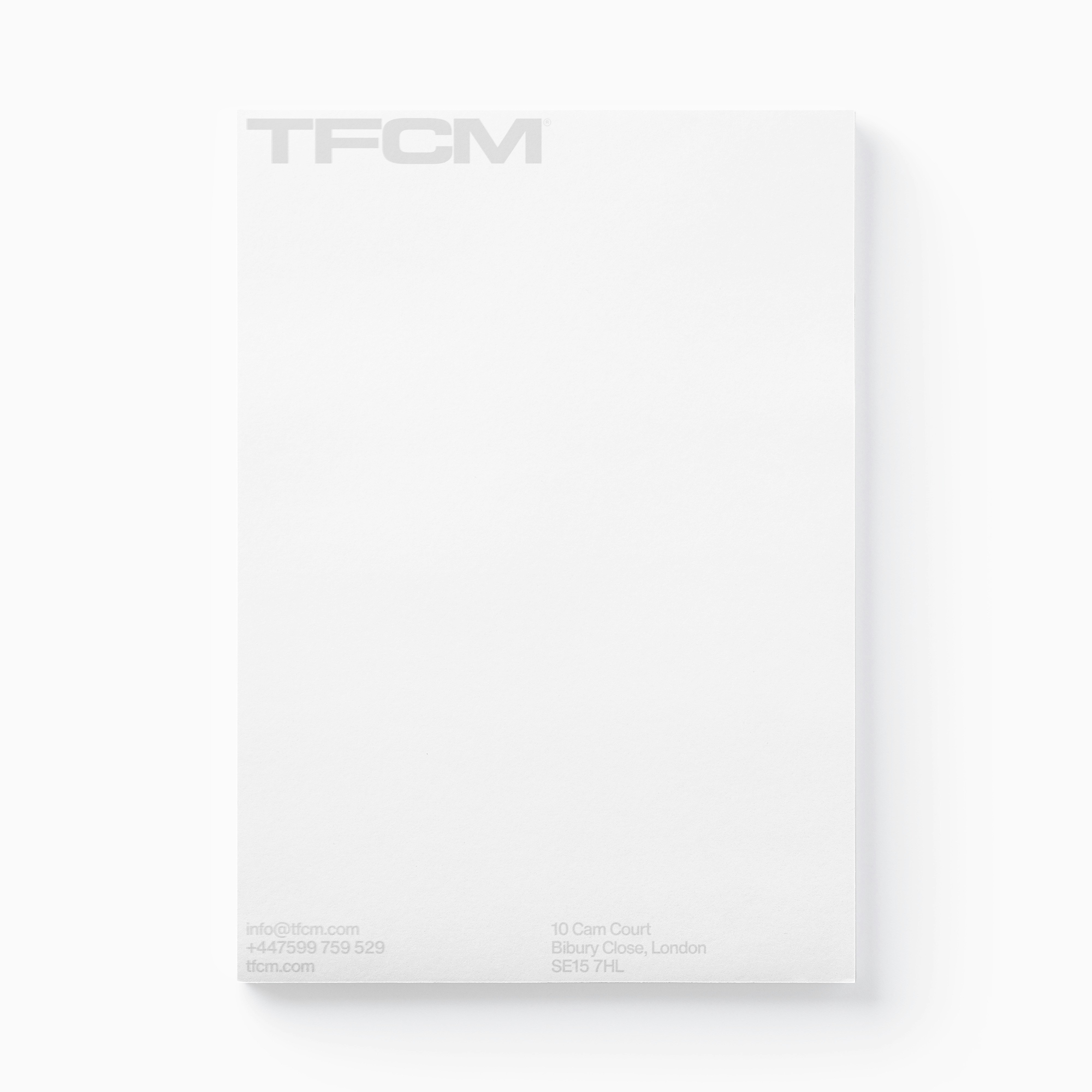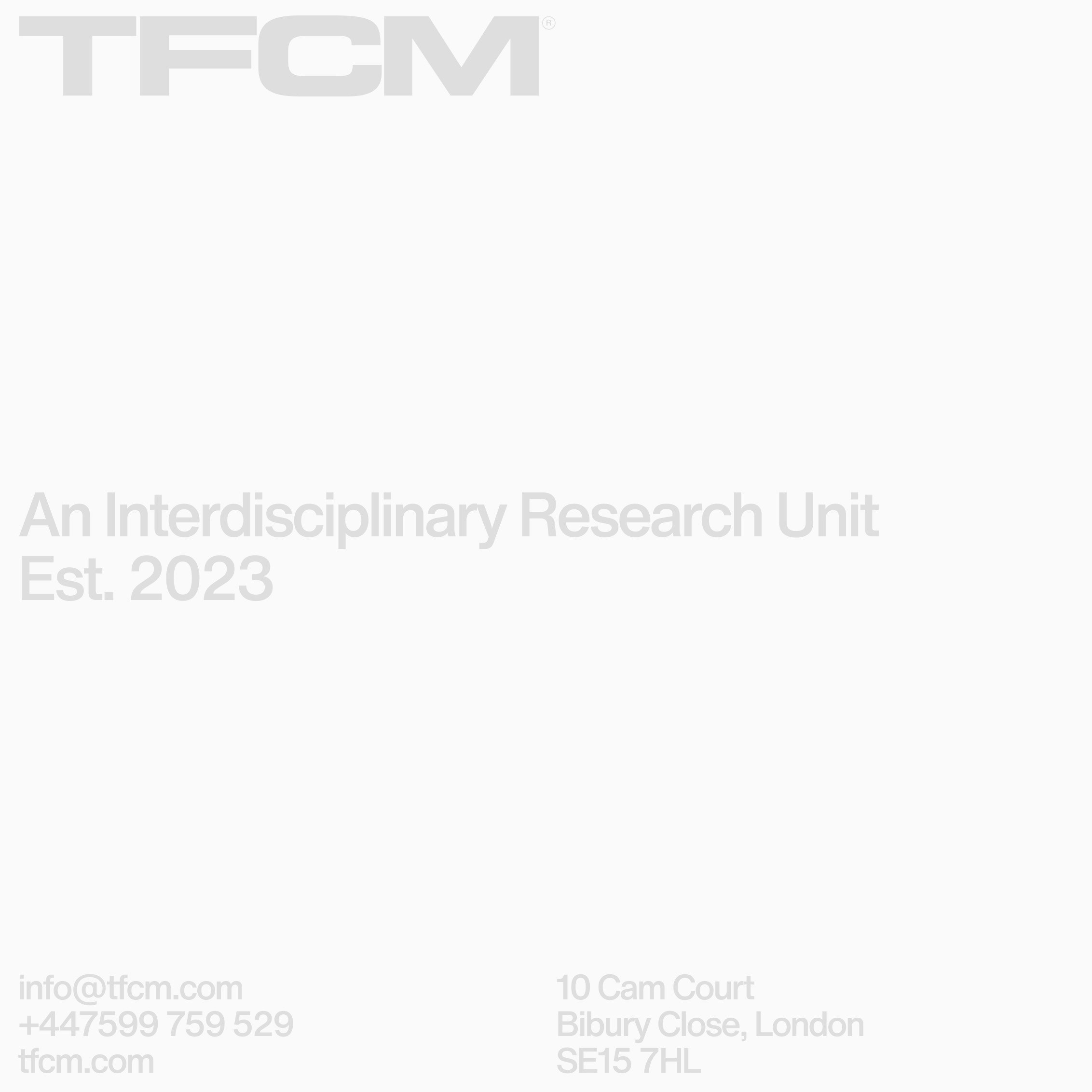 TFCM is a research, architecture, design and technology studio currently based in London. The aim was to create a visual identity that wouldn’t look out of place in a construction, research, visual design or technology context, and to contrast alpha typographic treatment with a soft colour palette.